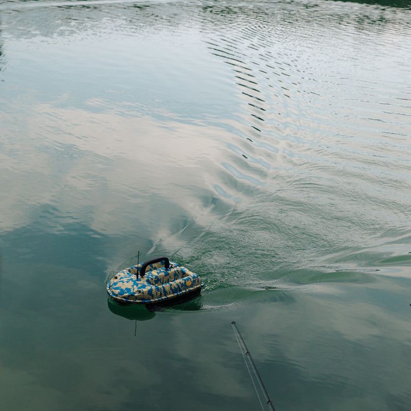 Das Boot ist mit einem 2,4-GHz-Funksystem ausgestattet. Dank der Reichweite von 800 Metern kann es bis zu 4 kg Köder an den gewünschten Angelplatz transportieren. Wenn das Funksignal zu schwach ist, hört das Boot auf, vorwärts zu fahren, und dreht sich im Kreis, bis das Signal wieder stark genug für eine sichere Steuerung des Bootes ist.