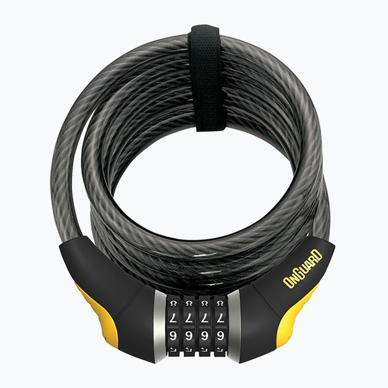 Das Fahrradschloss OnGuard Doberman 8031L ist ein spiralförmiges Stahlseil mit einem Zahlenschloss, das schnitt- und sägedicht ist. Der strapazierfähige Vinylschutz schützt vor Kratzern, und der mitgelieferte Klettverschluss erleichtert das Zusammenbinden des gewickelten Seils.