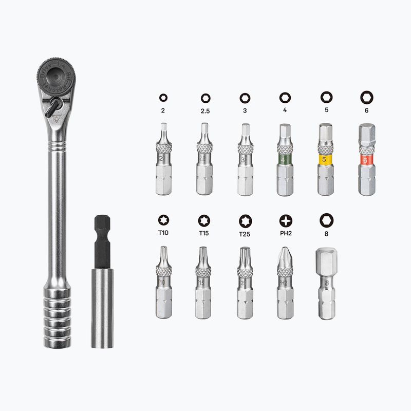 Im Topeak Ratchet Rocket Essential HD Modell wurde ein Ratschenmechanismus integriert, der ein effizientes Anziehen und Lösen von Schrauben an schwer zugänglichen Stellen ermöglicht. Im Set befinden sich Innensechskant-Schlüssel in den Größen 2, 2,5, 3, 4, 5, 6 sowie 8 mm, sowie ein PH2 Schraubendreher, was eine vollständige Abdeckung der am häufigsten vorkommenden Standards bei Fahrrädern gewährleistet. Das Werkzeug ist für schnelle Eingriffe sowohl im Gelände als auch im stationären Service optimiert.